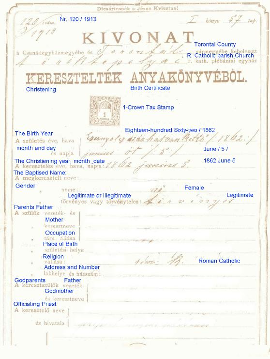 1913 issue of a Roman Catholic Birth Certificate (Kivonat); Birth of 1862.