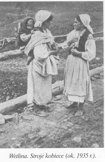 Education and CultureIn his report written in 1790 a local priest mentioned 24 children, who, in his opinion, were capable of going to school. In 1821 there is a note mentioning the existence of the parochial school. In 1847-49, the teacher was Grzegorz Sydorak. In these three consecutive years the school was attended respectively by 16, 6 and 14 students. In 1890 the public school was open. Until 1918 it was a one grade and one room school and the teaching language was Ukrainian. Figure 7: PHOTO (pg. 395): Wetlina: bridesmaids from about 1935 Figure 8: PHOTO (pg. 396): Wetlina: bridesmaids from about 1935 Teachers:
