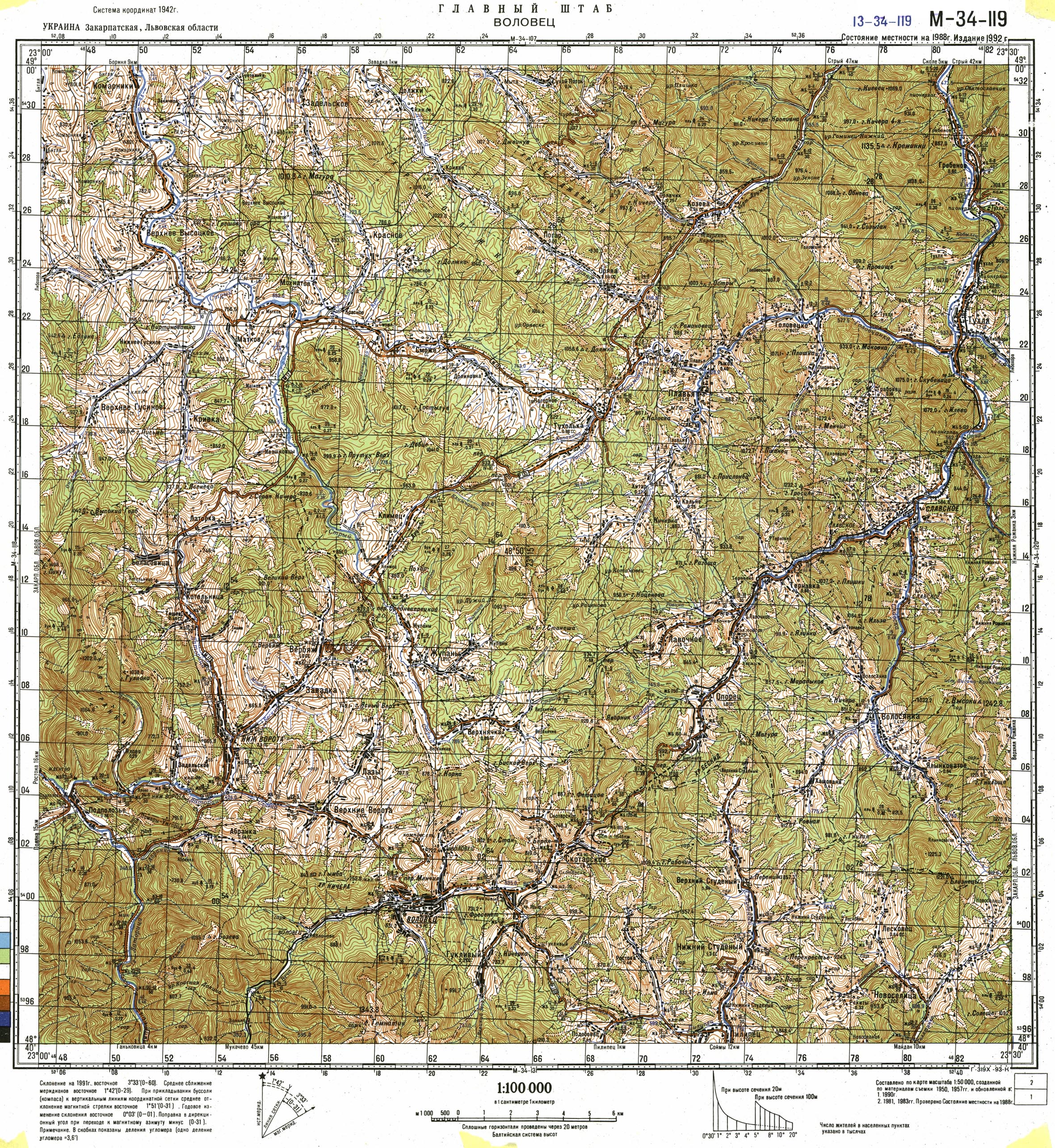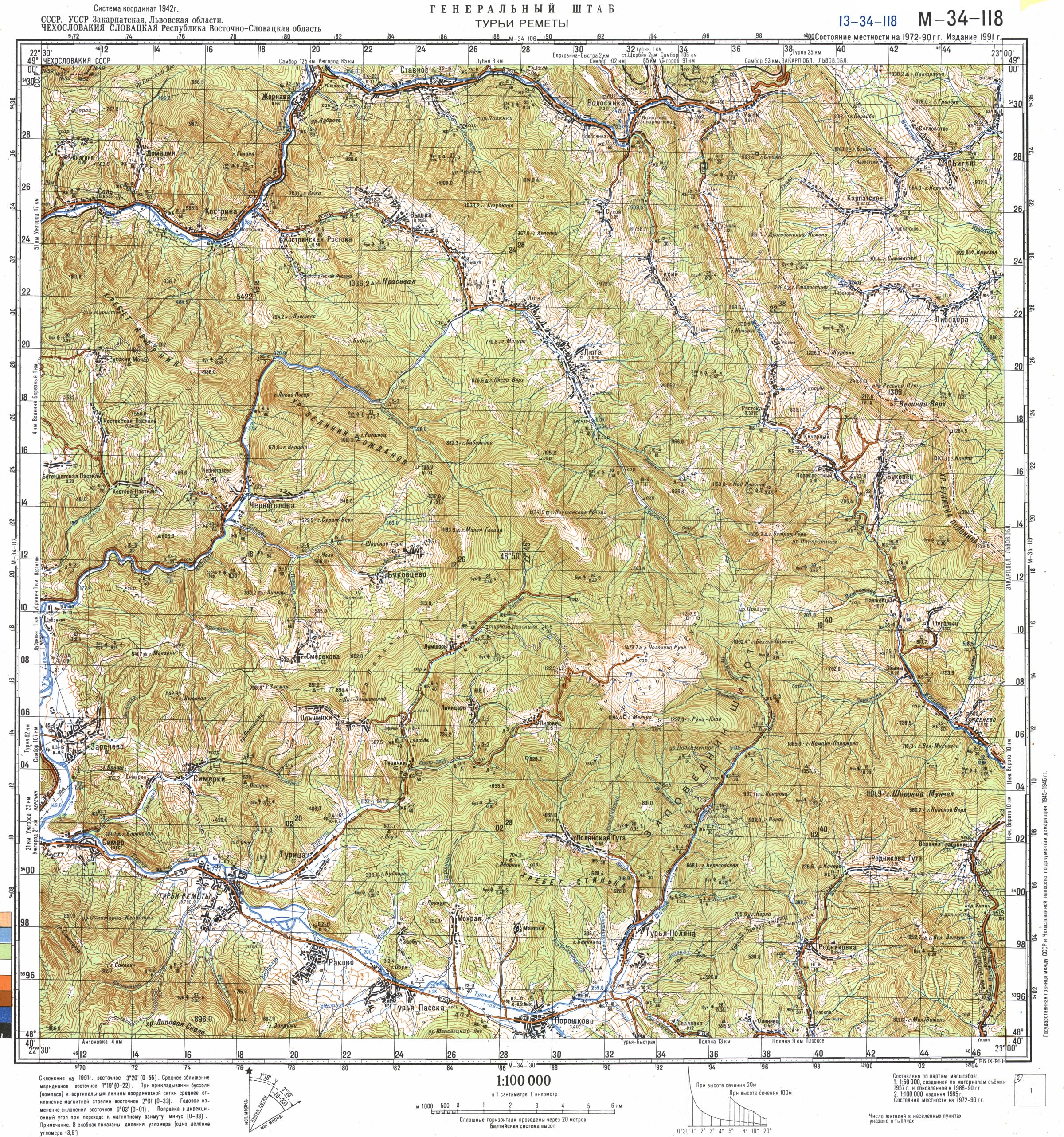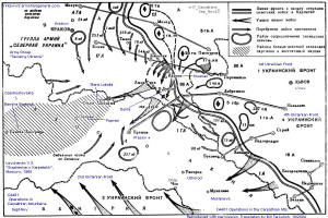| Soviet Army thrust from the Carpathian Mountain ridge (from Kremenic peak south). Southerly movement from fringes of today's Slovakia and western Ukraine, towards (Velky) Bereznja, with the forward objective of Uzhorod. Operations take place in moderately rugged, wooded mountains which are easily defended. In the valley are small villages (approx 70 to 120 houses per village.) Many houses are burned by the retreating German troops. Map quality is marginal. | | The above maps are reproduced and annotated by permission of Alex at Armchair General, where a fairly broad set of WWII Soviet-authored maps can be found. |